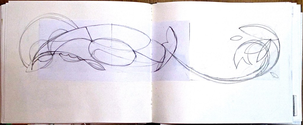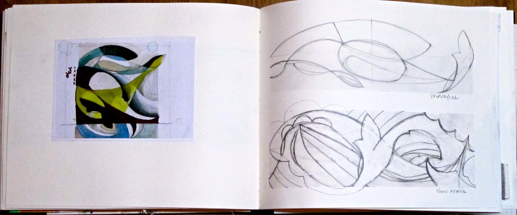 My processes usually begin by exploring through drawing, exploiting form and colour. Ideas can be swiftly abandoned or further worked upon, taken through various stages: perhaps design, painted and sampled until I feel that they may make a final textile piece or painting. My processes use a lot of collage, paint and coloured pencils. A selection of workings can be seen below: